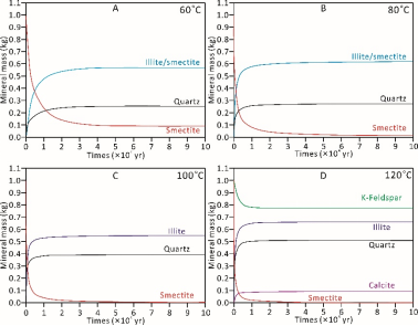 图3 数值模拟显示不同温度条件下,蒙脱石伊利化、钾长石溶蚀与石英沉淀反应演化路径
