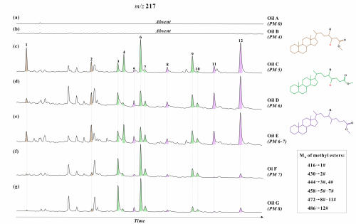 williamhill英国朱钢添副教授团队选取南襄盆地泌阳凹陷原油作为研究对象,通过气相色谱-质谱(GC-MS)、全二维气相色谱-飞行时间质谱(GC×GC/ToF-MS),系统分析了一系列母源关系接近但生物降解等级不同的原油样品中的甾烷酸分布。GC-MS分析结果表明,在未降解和低降解等级的原油样品中,未检出甾烷酸信号,只有在生物等级较高(规则甾烷开始发生明显降解)的原油样品中才能检测到甾烷酸,说明该类酸性生物标志物是甾烷的生物降解产物(图1)。
