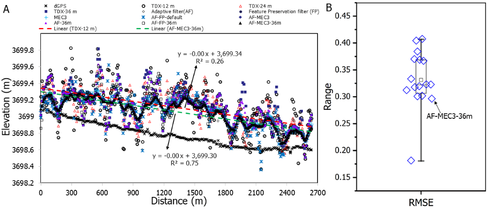 2 TDX-12 m数据经过平滑和粗化处理后的结果(A)和与dGPS实测数据的比较(B