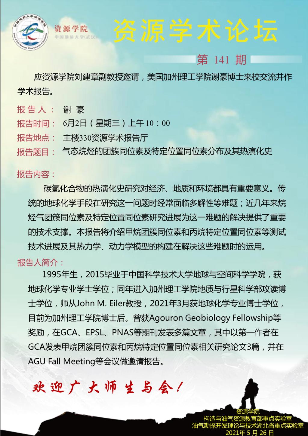 【05月26日】第141期资源学术论坛:谢豪学术报告