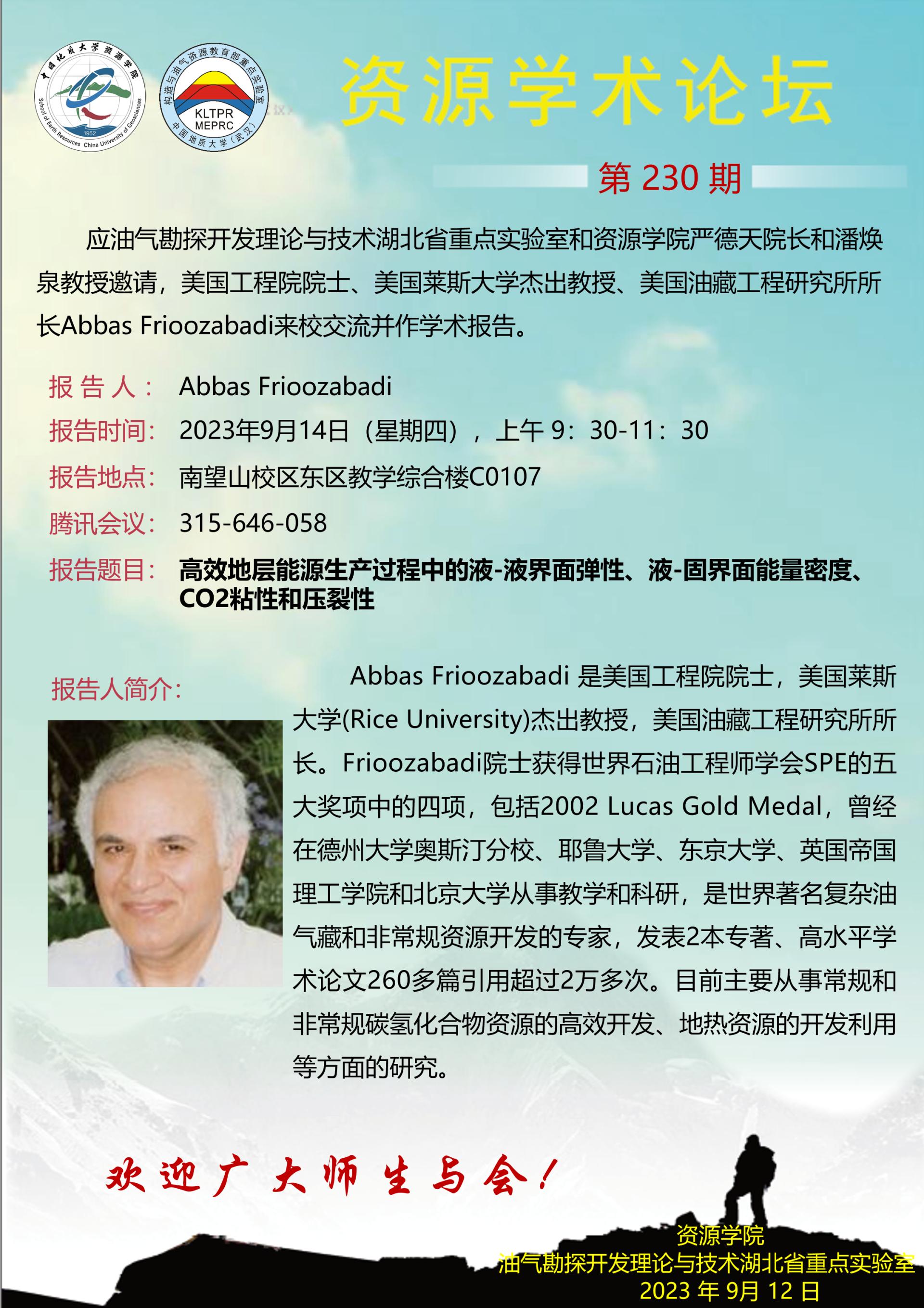 【9月14日】第230期资源学术论坛:Abbas Frioozabadi学术报告