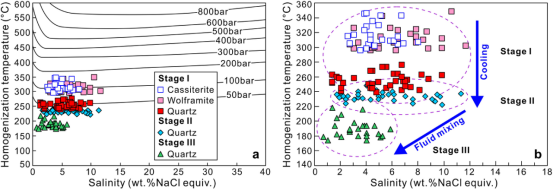 图3 Hermyingyi钨锡矿床(a)不同成矿阶段流体捕获压力估算和(b)均一温度-盐度图解