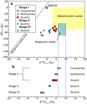 图4 Hermyingyi钨锡矿床(a)不同成矿阶段流体氢、氧同位素组成和(b)与石英、黑钨矿和锡石平衡的流体氧同位素组成