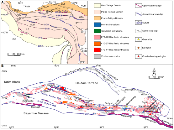 1、东昆仑造山带在早古生代经历了原特提斯洋俯冲(520–450 Ma),大陆碰撞(450–426 Ma)与岩石圈折返(426–410 Ma)、后碰撞垮塌(410–390 Ma)等多个构造演化阶段。