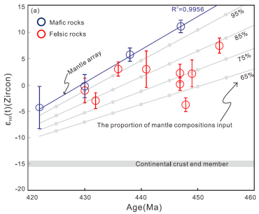 3、原特提斯洋俯冲和大陆碰撞背景下(520–426 Ma)形成的岩石以赞岐质高镁闪长岩、埃达克岩和经典I型花岗岩为主,岩浆源区中岩石圈地幔和俯冲板片来源的新生组分占比>65%,进一步证明大洋俯冲和大陆碰撞环境下壳下岩浆添加对于地壳增长的重要贡献(图3)。