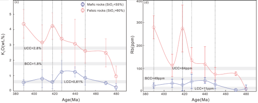 4、俯冲大陆岩石圈折返和后碰撞垮塌背景下(426–390 Ma)产出的S型-I型-A型侵入岩多源于新生/古老地壳的重熔,这使得造山带内火成岩中不相容元素代表的地壳成熟度显著升高(图4)。