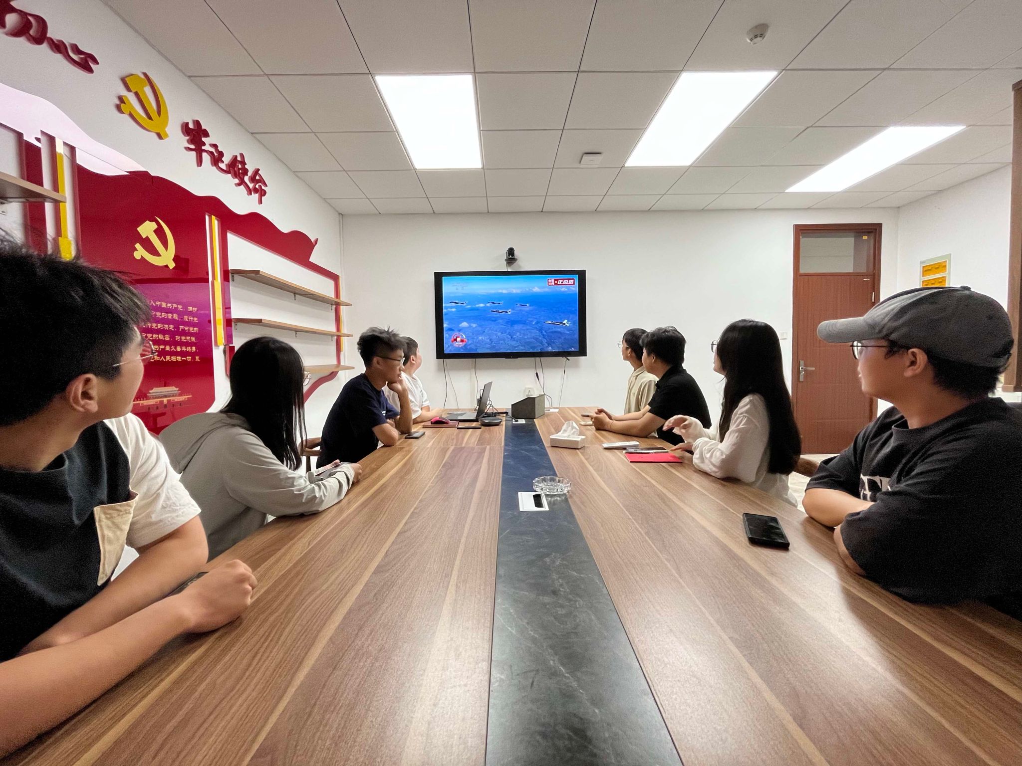 学生党建办公室成员、学生党支部党员代表在文华楼523室观看纪念大会