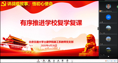 战疫故事,践行初心使命。支部成员围绕疫情防控、网络授课、人才培养、学生就业等主题开展讨论,说身边故事、讲切身体会。我校教师吴正彬作为武汉疫情防控的志愿者,面临严重的疫情形势冲在一线;孙梦迪在疫情期间小孩出生,克服了诸多困难,也感受到来自周围的温暖。北京交通大学土建学院教师常鹏主要结合自身在疫情期间获得的组织帮助,以及疫情期间如何克服在线教学困难分享了自己的体会;孙静主要从党支部工作的角度,交流了党支部如何做实做细疫情防控工作。