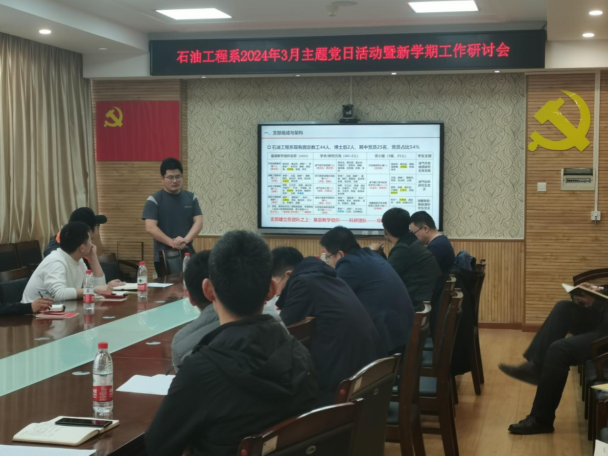 张恒从支部组成与构架、石油工程办学现状分析和党建活动方案等方面介绍了2024年石油工程系党支部党建计划与思考,提出痛点问题,着力开展继“基层组织在行动”之后的“导学团队在行动”系列活动,包括“学务指导”型师生见面会和专业技能交流会、“就业指导”型专题讲座活动、“传帮带”型专题培训会和经验分享会,并积极与校内外党支部联合举办党建活动,加强校企党建联建与合作交流,提高党建业务双融双促。