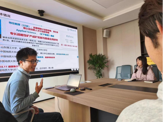 接着,陈教教授与学生们进行互动研讨。他以资源勘查工程2020级基地班的优秀学生代表吕骏腾为例,介绍他在学习、生活以及学生工作中的优秀事迹,为同学们树立榜样典型,鼓励同学们身体力行,践行地大“艰苦朴素、求真务实”的校训,争做做一名优秀的地大人。