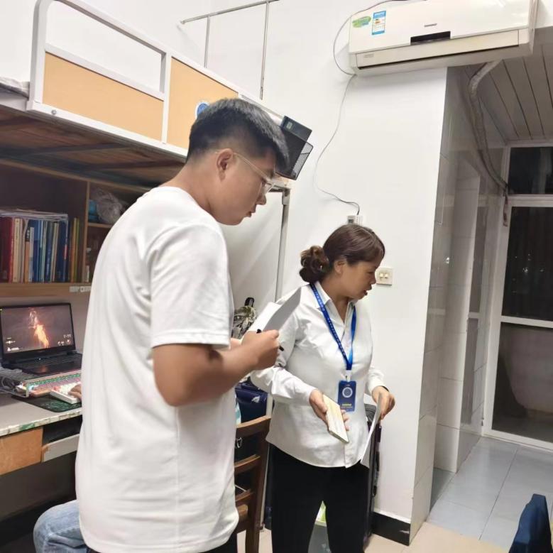 除了卫生检查工作,学生住宿服务中心的老师也关心了同学们在宿舍的生活情况。同学们踊跃提问关于宿舍卫生方面的问题,如洗手池水垢难以清理干净、衣柜旁卫生死角如何打扫等,老师对同学们的困惑一一进行了详细解答,并且着重关心了刚刚进入大学生活的大一同学的生活适应情况。