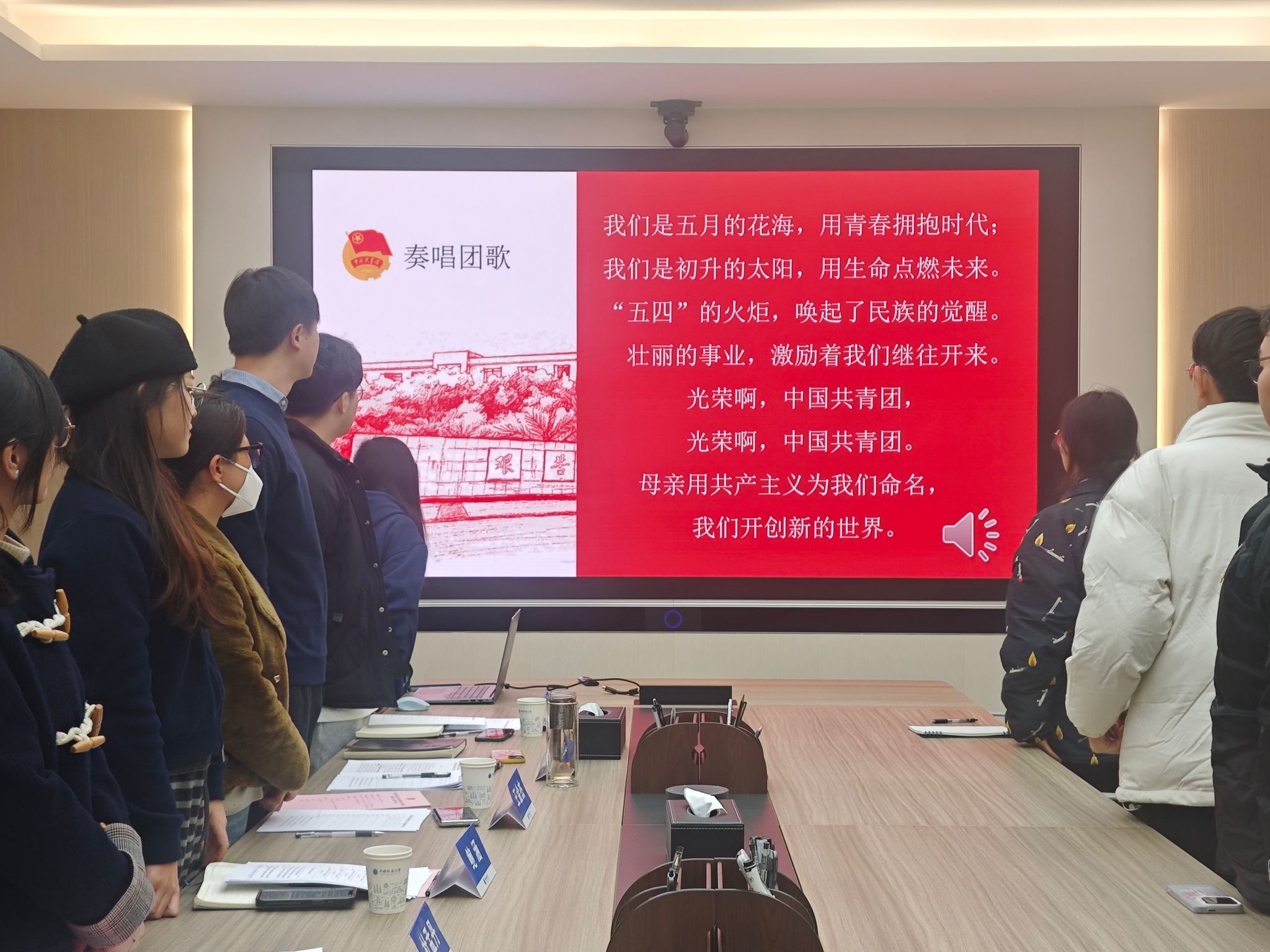 在团日活动上,全体成员奏唱团歌,并重温入团誓词。