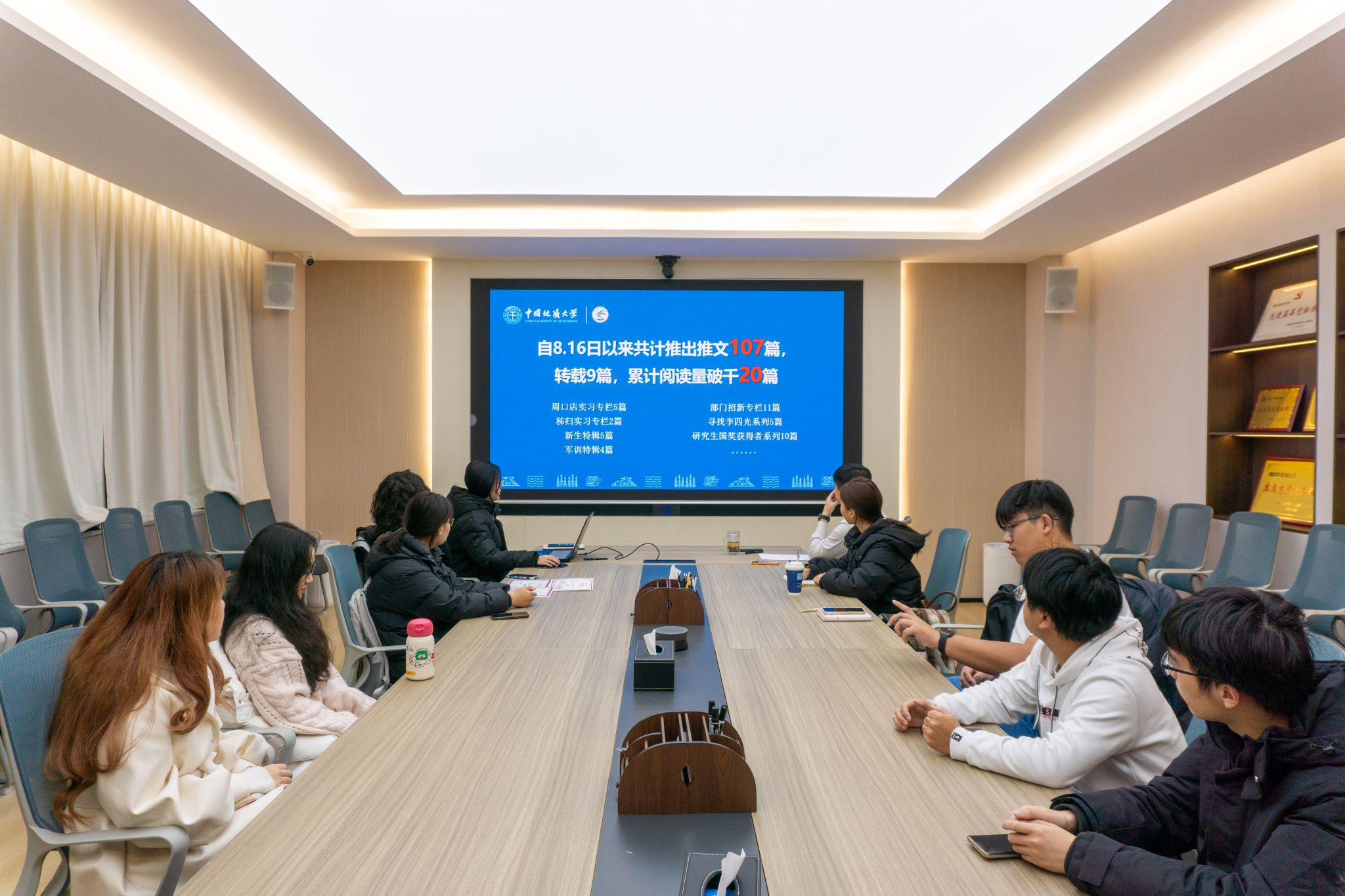 影音部、运营部、办公室、设计部和采编部围绕部门建设、技能培训、学年工作推进情况等内容对宣传工作进行展示汇报。