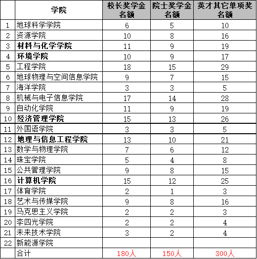 1.“地大英才奖学金”项目(“李四光英才奖”、“少数民族学生奖”、“创新创业之星奖”除外)采取等额评选办法,学院具体名额见下表:
