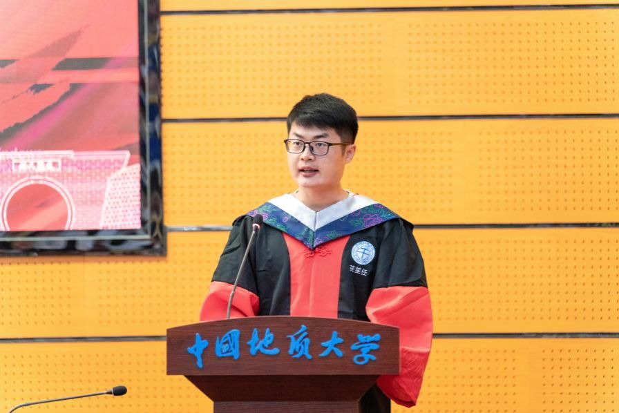 研究生毕业生代表苌笙任发言。他深情回顾了在学院度过的十年时光,表达了对母校、导师及同学们的感激之情。他提到,地大的系统培养和学术资源为他筑就了坚实的学科基础,科研时光和国际视野的拓展让他收获满满。面对未来,他立志奔赴中石油新疆油田,以所学支持边疆建设,践行地质报国使命,将个人理想融入国家需求,展现地大人的担当与使命。