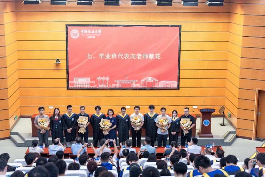 毕业班代表向班主任、辅导员献花。感恩老师们一路的辛勤培育和悉心培养。