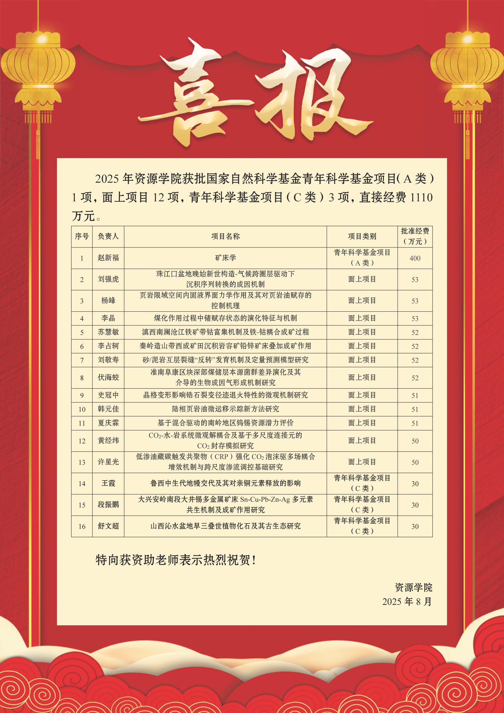 8月27日,国家自然科学基金委员会公布了2025年集中接收期项目评审结果,williamhill英国获批资助项目共16项。其中,青年科学基金项目(A类)1项,面上项目12项,青年科学基金项目(C类)3项。项目直接经费达1110万元,较2024年增长63.2%,经费数量位居全校第二。