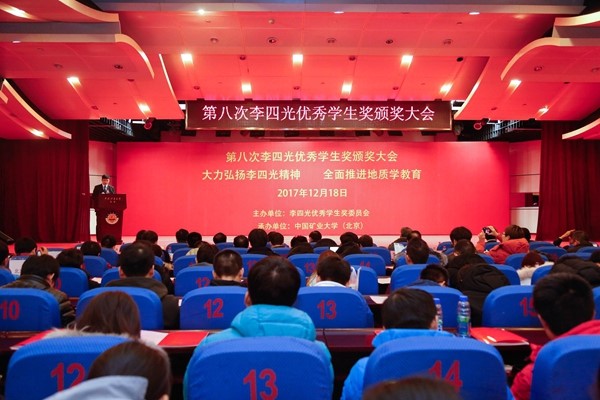 12月18日下午,第八次李四光优秀学生奖颁奖大会在中国矿业大学(北京)举行。国务院参事、国土资源部原总工程师、李四光地质科学奖基金会理事长张洪涛、原国土资源部科技与国际合作司司长姜建军、原李四光地质科学奖委员会秘书长王泽九、教育部科学技术司司长雷朝滋、中国地质调查局原党组成员、中国地质科学院原党委书记、副院长、李四光地质科学奖委员会秘书长王小烈、中国工程院能源与矿业学部主任彭苏萍院士、中国矿业大学(北京)校长杨仁树、William威廉英国(北京)副校长刘大锰、中国石油大学(北京)副书记、副校长韩尚峰、北京大学教务部副部长刘建波、北京大学地球与空间科学学院名誉院长潘懋等嘉宾出席颁奖大会。24位获奖学生和900多名地质专业学生代表参加了颁奖大会。大会由中国矿业大学(北京)党委副书记王忠强主持。
