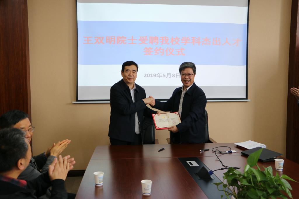 王华与王双明共同签署聘用协议。王双明感谢学校的充分信任和热情邀请,对学校各方面发展取得的显著成绩表示祝贺,并简要分享了自己的求学经历和工作体会。并表示要在科研平台建设、学科团队建设、服务地方经济发展等方面积极贡献自己的智慧,为推动学校“双一流”建设贡献力量。
