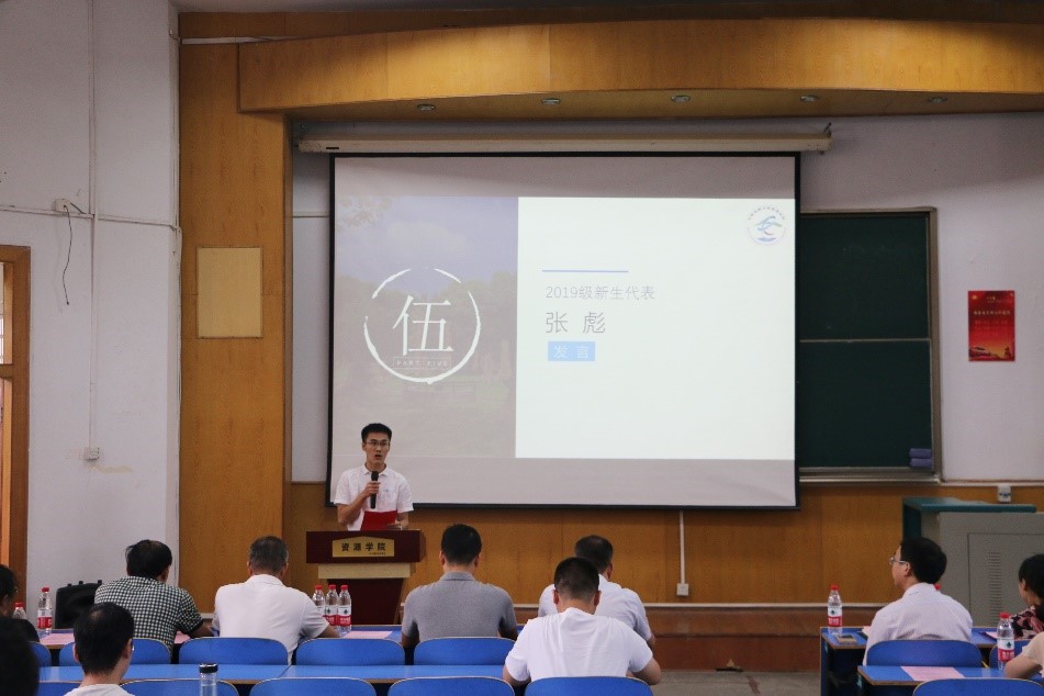 2019级本科生新生代表孟令琨发言,他表示将求真学问、做高尚人、炼包容心,带着对知识的渴望和对新生活的向往在地大学习成长。