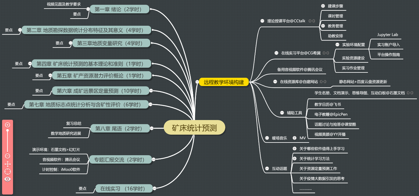 在讲课过程中,老师需要临场发挥但幻灯片内容和当前话题无关,可以利用电子教鞭工具直接将屏幕变成白板边讲边画、或者打开引擎搜索/百科/知乎搜索对应话题打开网页。让远端的学生感受到可视化的思维过程,变授人以鱼为授人以渔。进一步地,我也在构想某些教学环节中能否摆脱对PPT的依赖,借助云计算辅助教学(ComputerAssistedInstructions,简称CAI))工具的优势,变知识单向输出为主的教师Talk为师生协同汇聚知识的Dialogue,变固化的PPT为灵机一动的PowerPoint画面呈现,变授人以渔为授人以欲来激发学生学习兴趣和求知欲。例如面向基地班教学过程中,可以充分利用卓越班已经发布的各类教学资源、网上开放的学习资源开展一定程度地自主学习(调研中不少学生也表示没有充足的时间在课堂外进行自学),在阶段小结或期末复习课堂内的有限时间的教学活动中,依托石墨文档(https://shimo.im/)等云办公软件的思维导图、互动白板工具,按指定的讨论主题、讲课提纲及教材章节标题为引导,师生在云端紧张协同地进行头脑风暴,共同编辑指定的思维导图文档或白板文档,让学生充分参与到教学活动中来,对教学要点内容进行师生共同的梳理和总结,各抒己见贡献自己的知识,同步呈现讨论思路及其结果。师生教学活动既然已经都全程在线了,不妨利用信息技术将教学活动的版图设计得更大些,让知识的力量“穿透”屏幕画面双向地“流”起来、“动”起来,见字如面,定格时光。