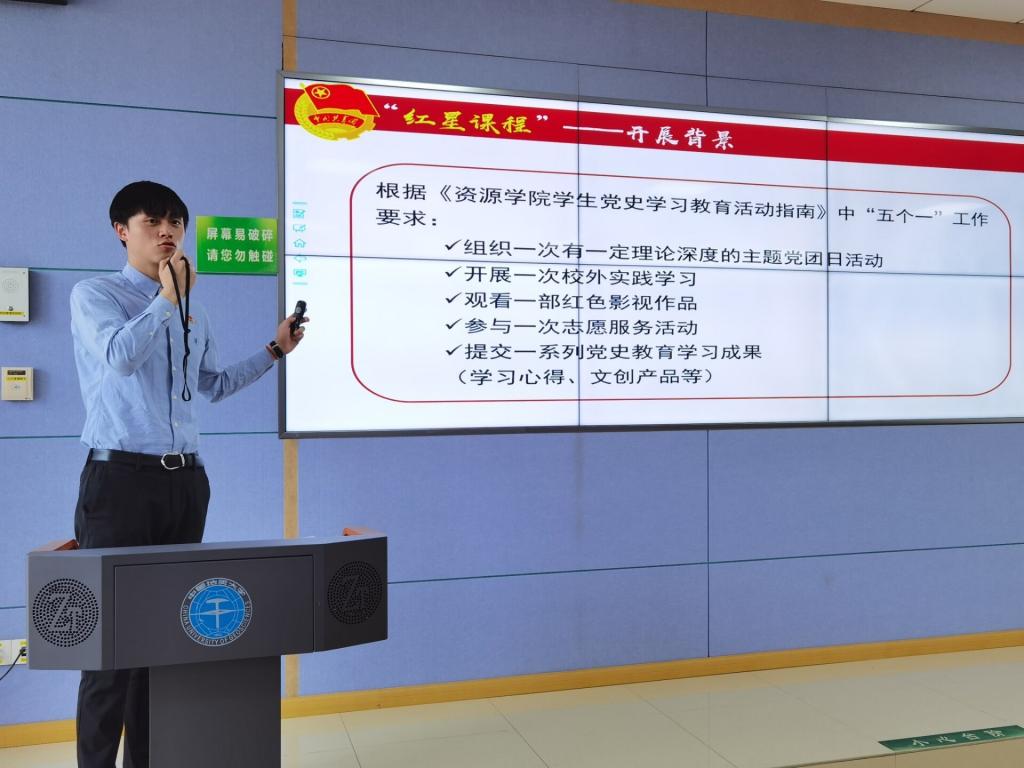 随后刘睿介绍红星课程。他详细讲解了“校内课程”“校外实践基地推荐”“党史学习教育影视作品推荐”等三份课程表,公布了预约方式、工作保障,并指导大家如何开好一次团会。他希望各支部书记要利用好学院团委供给的优质资源,把团会打造成政治理论学习、科研能力提升、文化素质拓展的“聚宝盆”,不断提升团会质量,并带领支部成员一同把学习成果转化成献身资源能源事业的扎实行动。