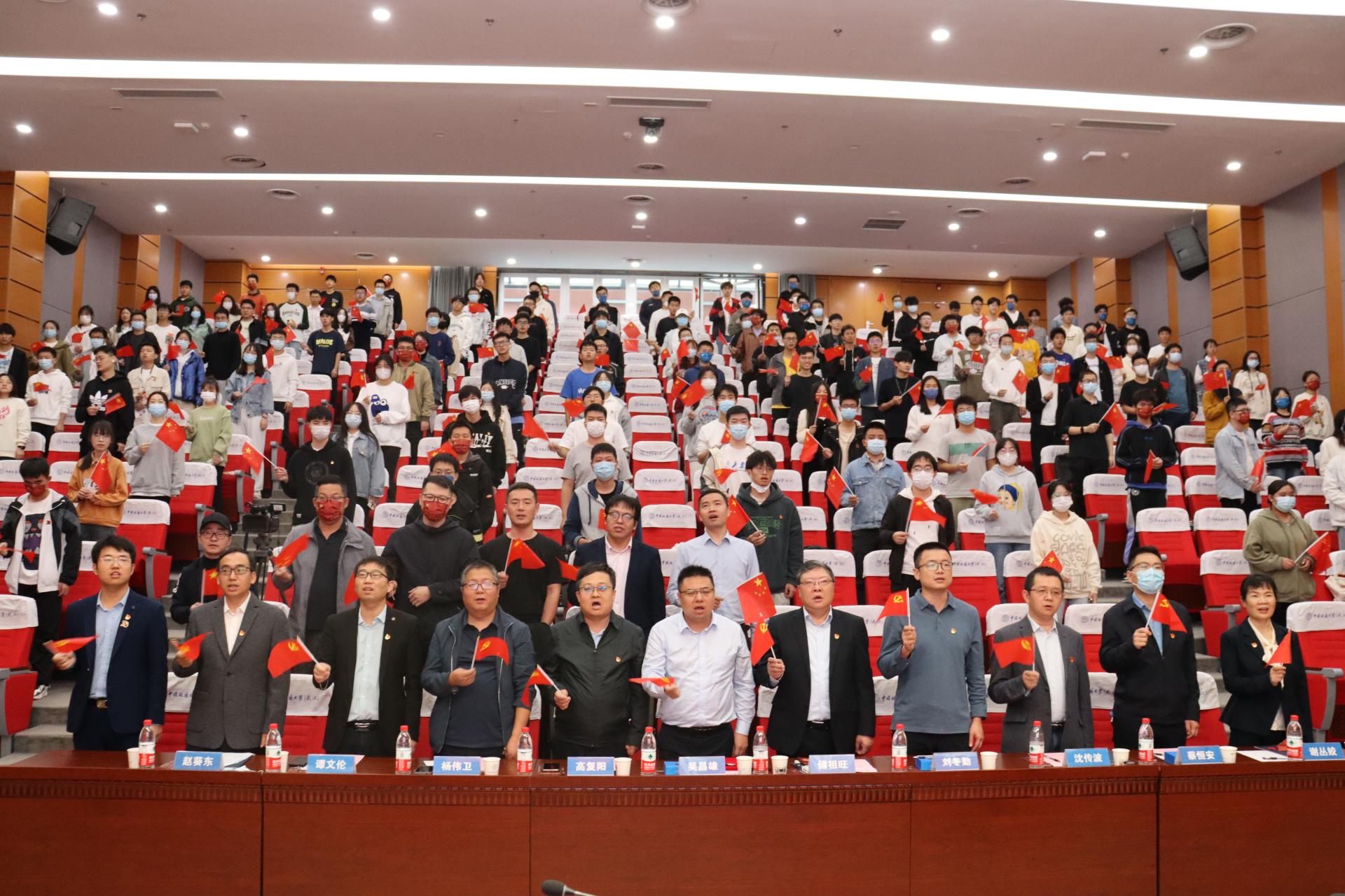 储祖旺为williamhill英国“资源能源宣讲团”授旗。武汉市委宣讲团成员、副院长沈传波教授,“志留纪”科普平台负责人、资源勘查工程专业2020级本科生吕骏腾代表接旗。