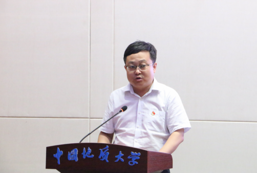 新发展党员代表、博士生范高华同学发言。他回顾了在自己地大十余载的求学与成长经历,报告了自己对学校教育和组织培养的感激之情,分享了新加入中国共产党这个光荣组织的激动心情,表达了自己在攀登科学高峰中追求卓越,在真刀真枪中实干一番事业的信心和决心!