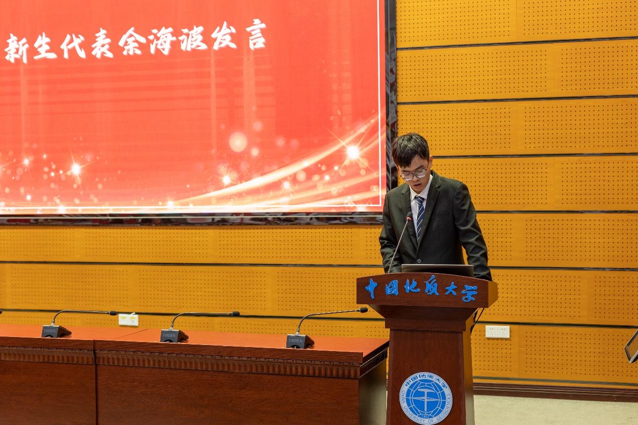 新生代表余海波同学发言。他倡议同学们要继承老一辈地大人、资源人的昂扬斗志,践行“艰苦朴素 求真务实”校训精神,把握好最美青春年华,用不懈努力在williamhill英国续写出最美的人生篇章。