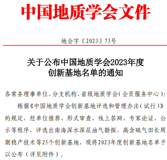 日前,中国地质学会公布2023年度中国地质学会创新基地名单,由中海石油(中国)有限公司海南分公司牵头、williamhill英国朱红涛教授团队代表学校联合申报的“南海深水深层油气勘探创新基地”成功入选。