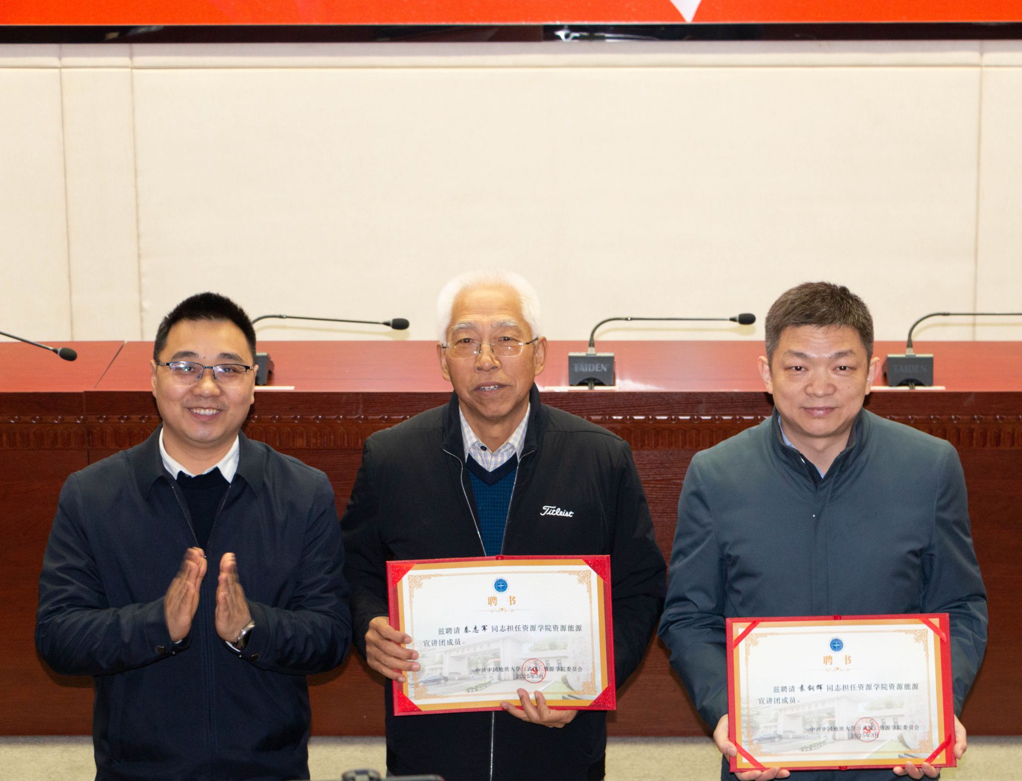williamhill英国党委书记汪再奇为秦志军董事长和袁钢辉总经理颁发williamhill英国产教融合企业导师聘书与资源能源宣讲团聘书。