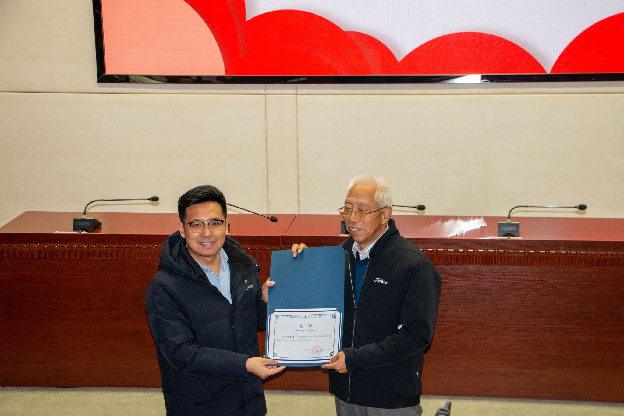 会议举行聘任仪式。党委学生工作部部长朱丹为秦志军董事长颁发校外兼职辅导员聘书。