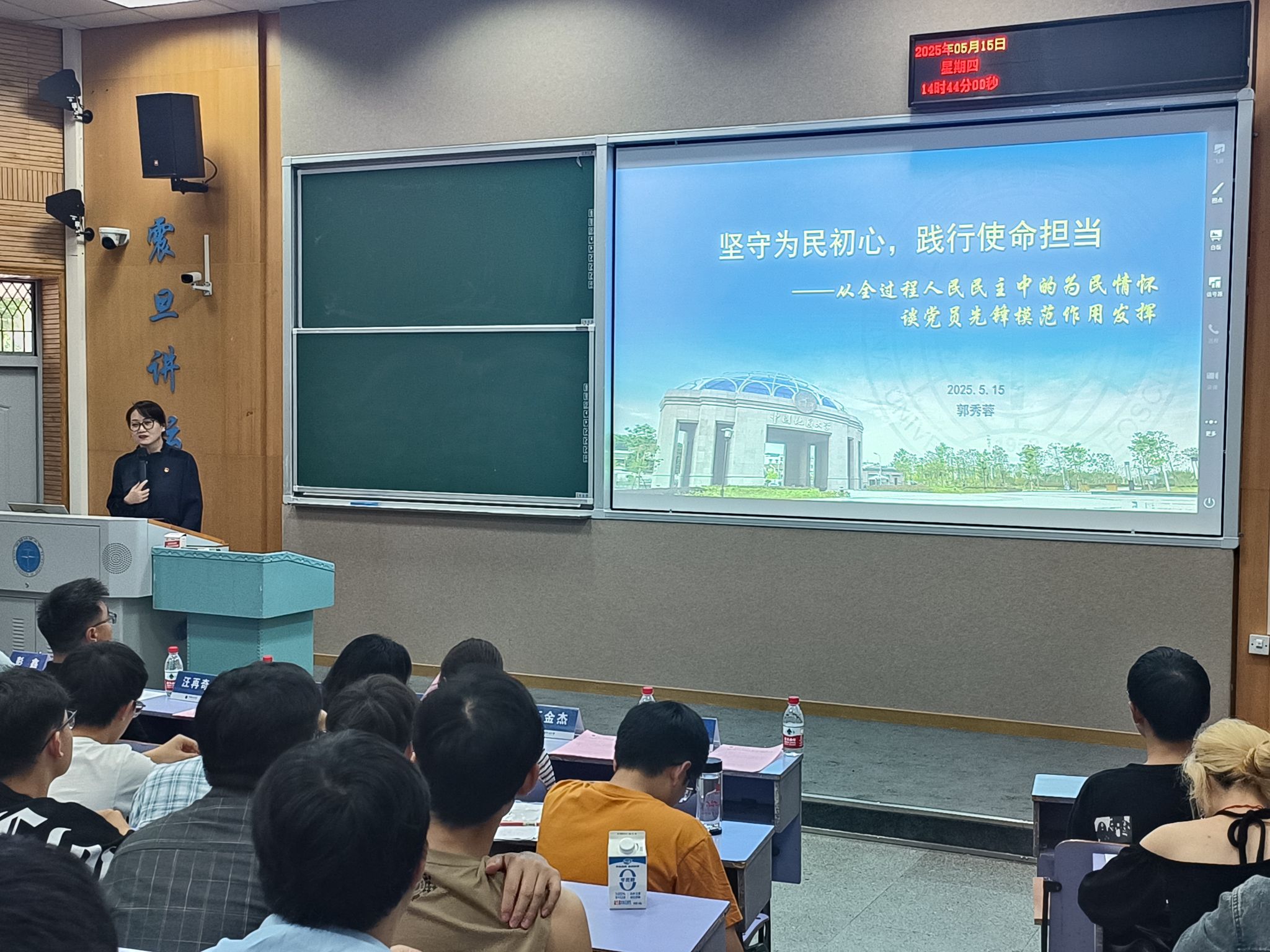 学校工会常务副主席、学院兼职组织员郭秀蓉以“坚守为民初心 践行使命担当—从全过程人民民主中的为民情怀谈党员先锋模范作用发挥”为题作专题汇报。她详细介绍了全过程人民民主的内涵,强调其以人民为中心的价值导向,并从为民情怀的视角探讨党员如何在实践中践行初心使命。她要求全体党员要充分发挥先锋模范作用,以实际行动做身边同学的排头兵、顶梁柱和连心桥。