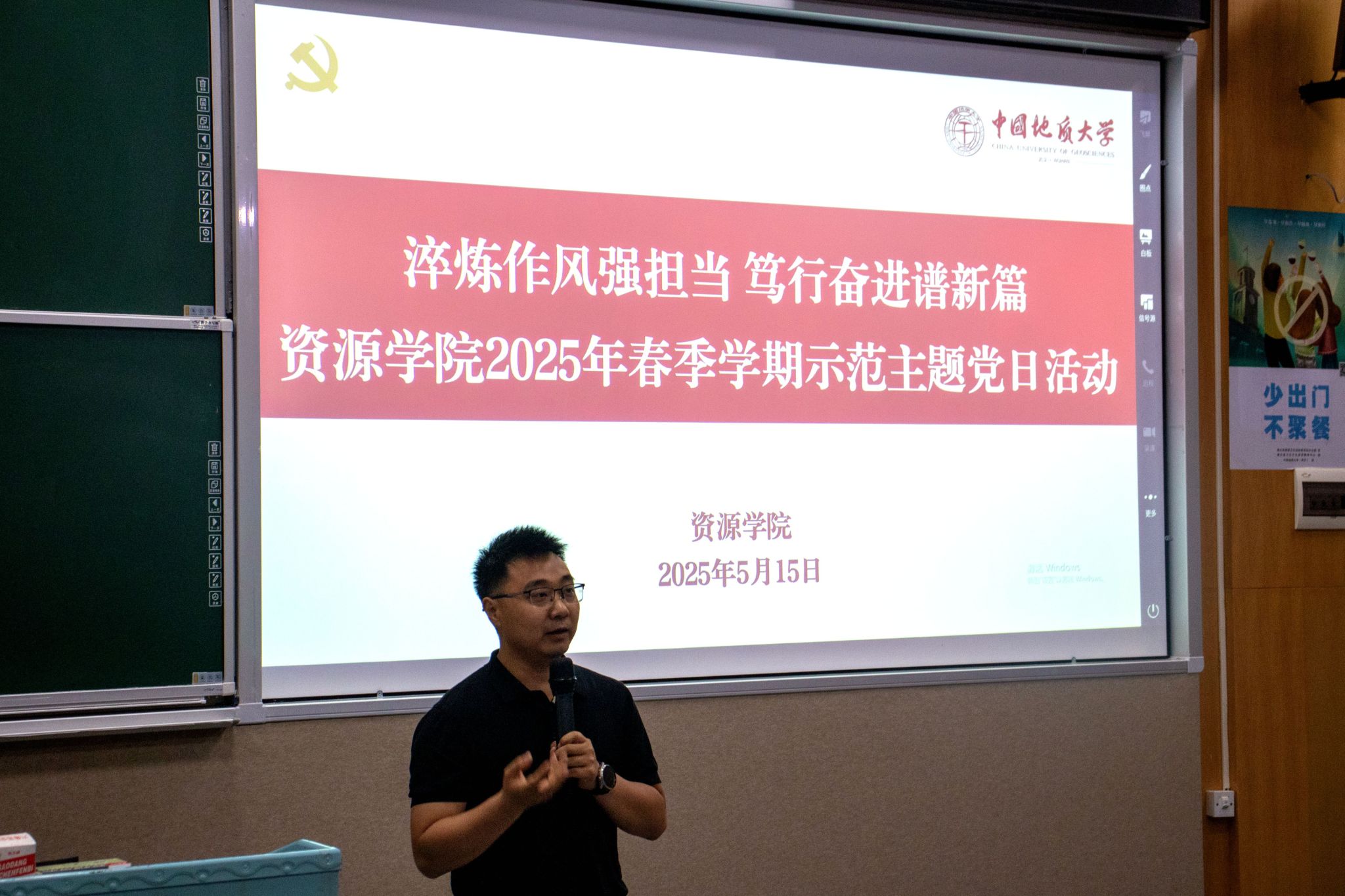 矿床学研究生党支部书记王显康领学党章第七章党的纪律第三十九至四十条内容。