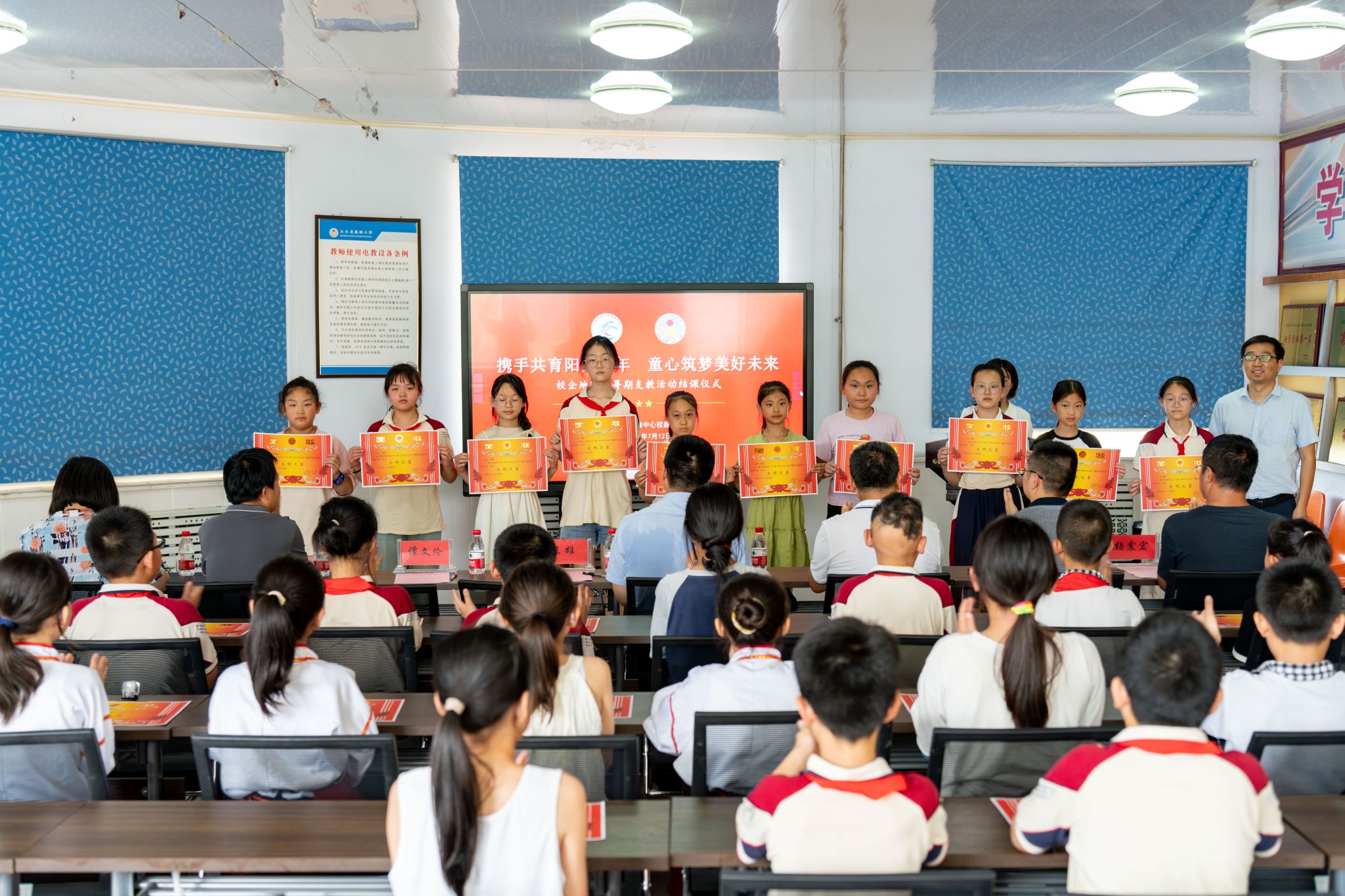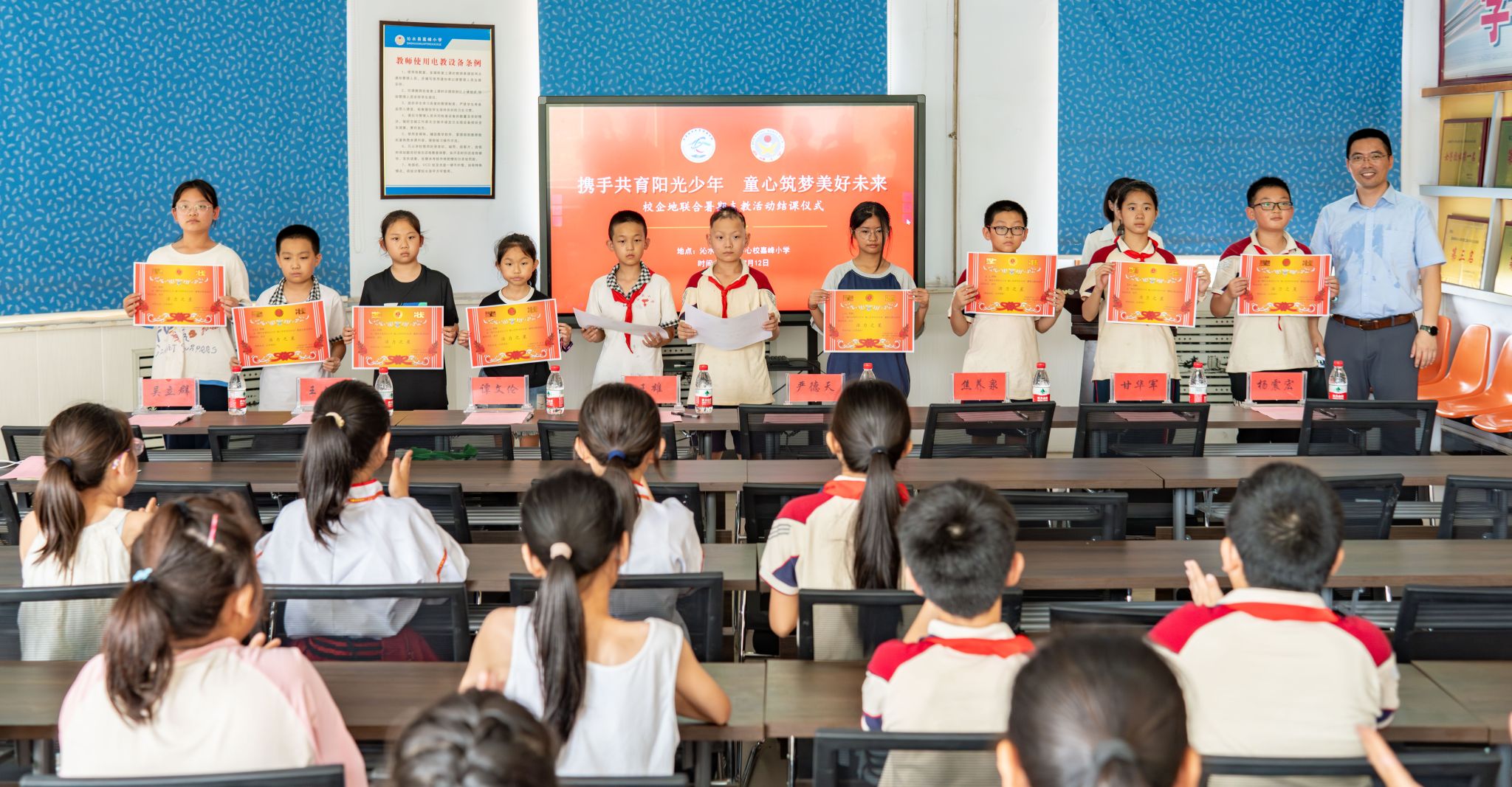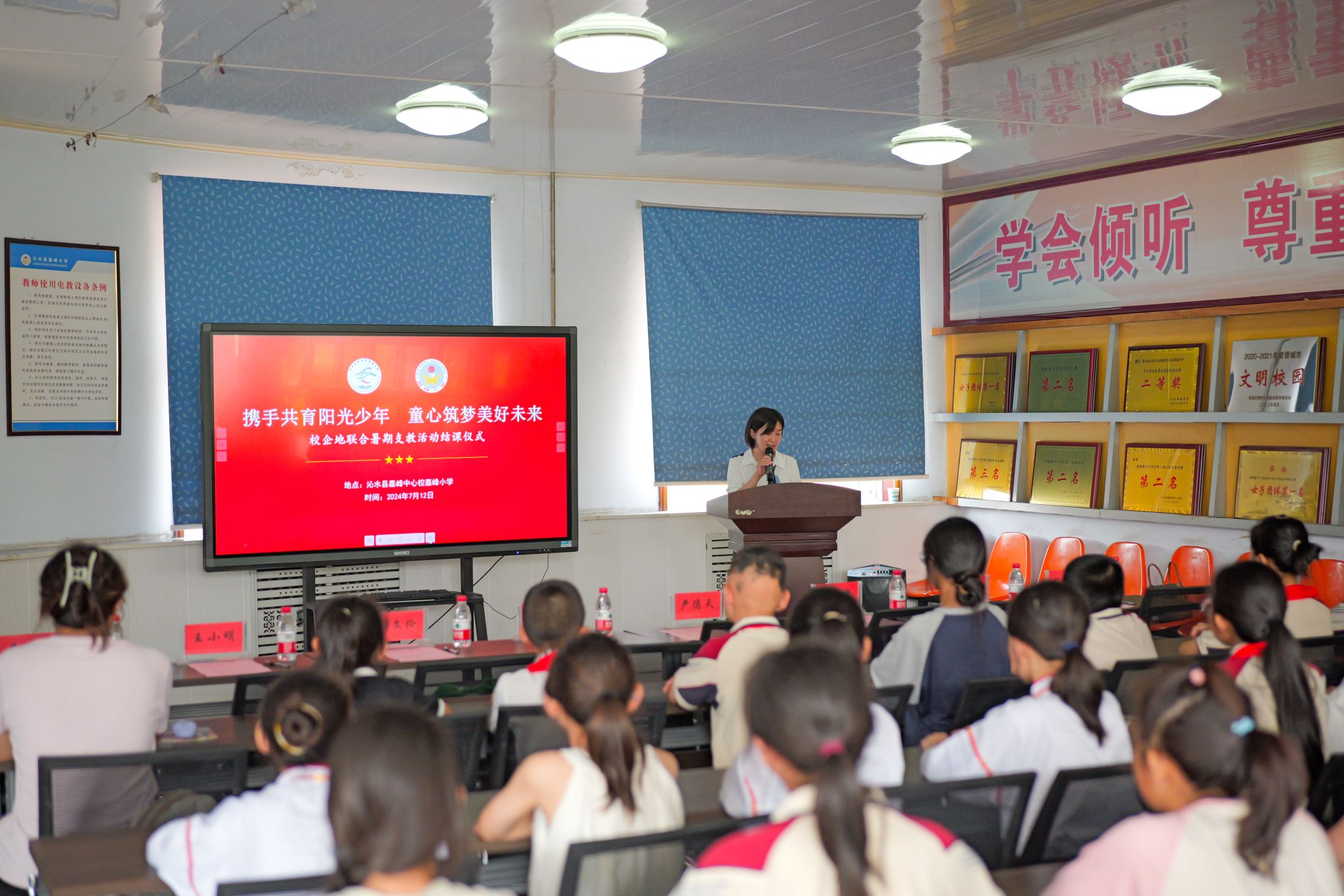 7月12日下午,由williamhill英国、共青团沁水县委联合举办的“携手共育阳光少年 童心筑梦美好未来”暑期支教活动结课仪式在沁水县嘉峰小学顺利举行。williamhill英国院长严德天、党委副书记谭文伦、“全国模范教师”焦养泉、盆地矿产系党支部书记王小明、盆地矿产系主任甘华军、副主任吴立群,共青团沁水县委书记王雄,嘉峰镇嘉峰中心校校长杨震宏,嘉峰镇嘉峰小学教职工、学生以及“牵手筑梦”实践服务团成员参加仪式。