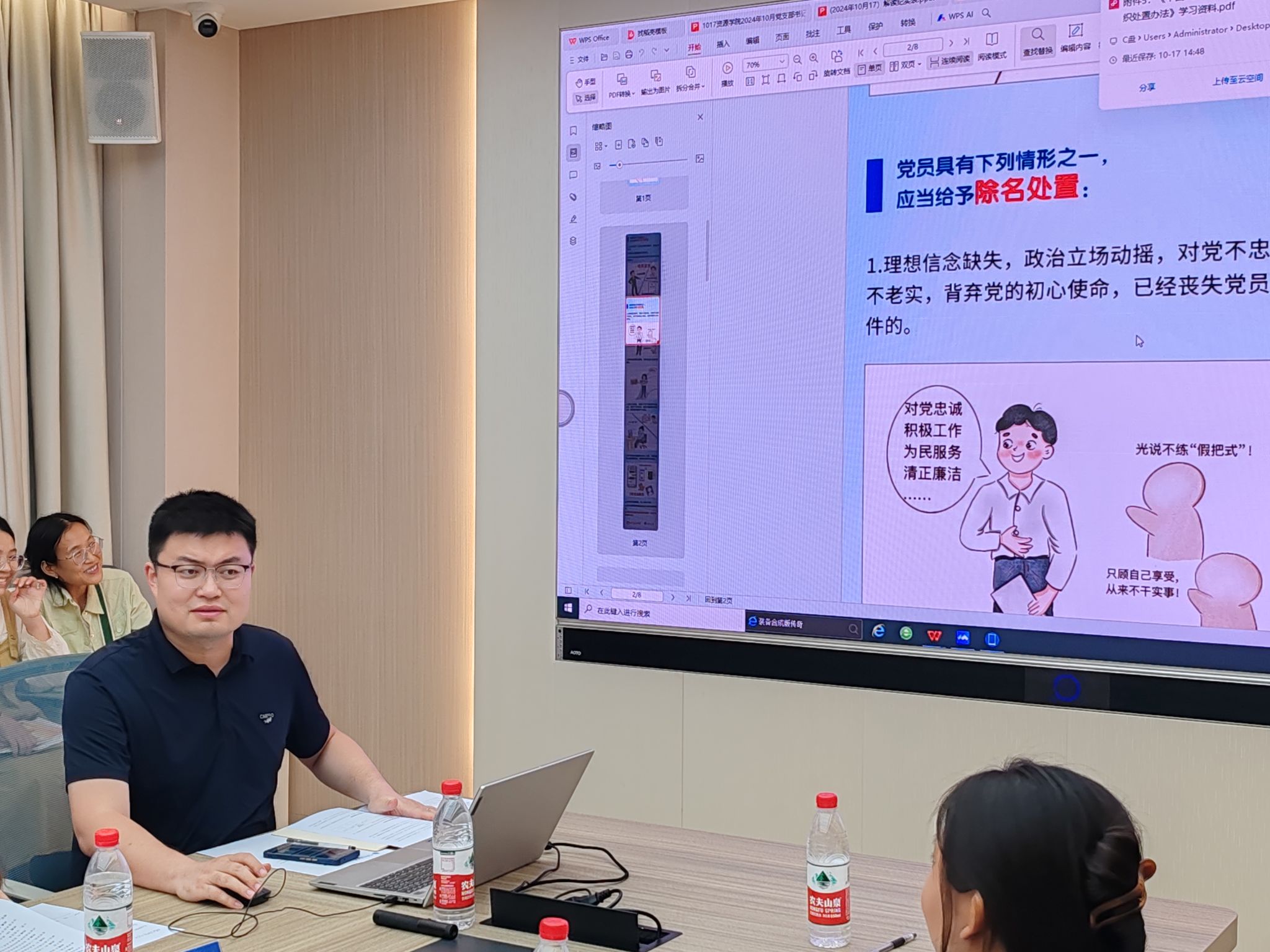 彭鑫对《中国共产党不合格党员组织处置办法》进行解读。他表示办法旨在强化党性教育与纪律建设,确保每一个党员都能在思想上、行动上与党中央保持高度一致,是加强党员队伍建设的重要环节。随后,他介绍了本学期党建工作安排,并希望各党支部围绕专业特点和具体实际,开展丰富多彩的党支部活动,打造资源独具特色的党建文化品牌。