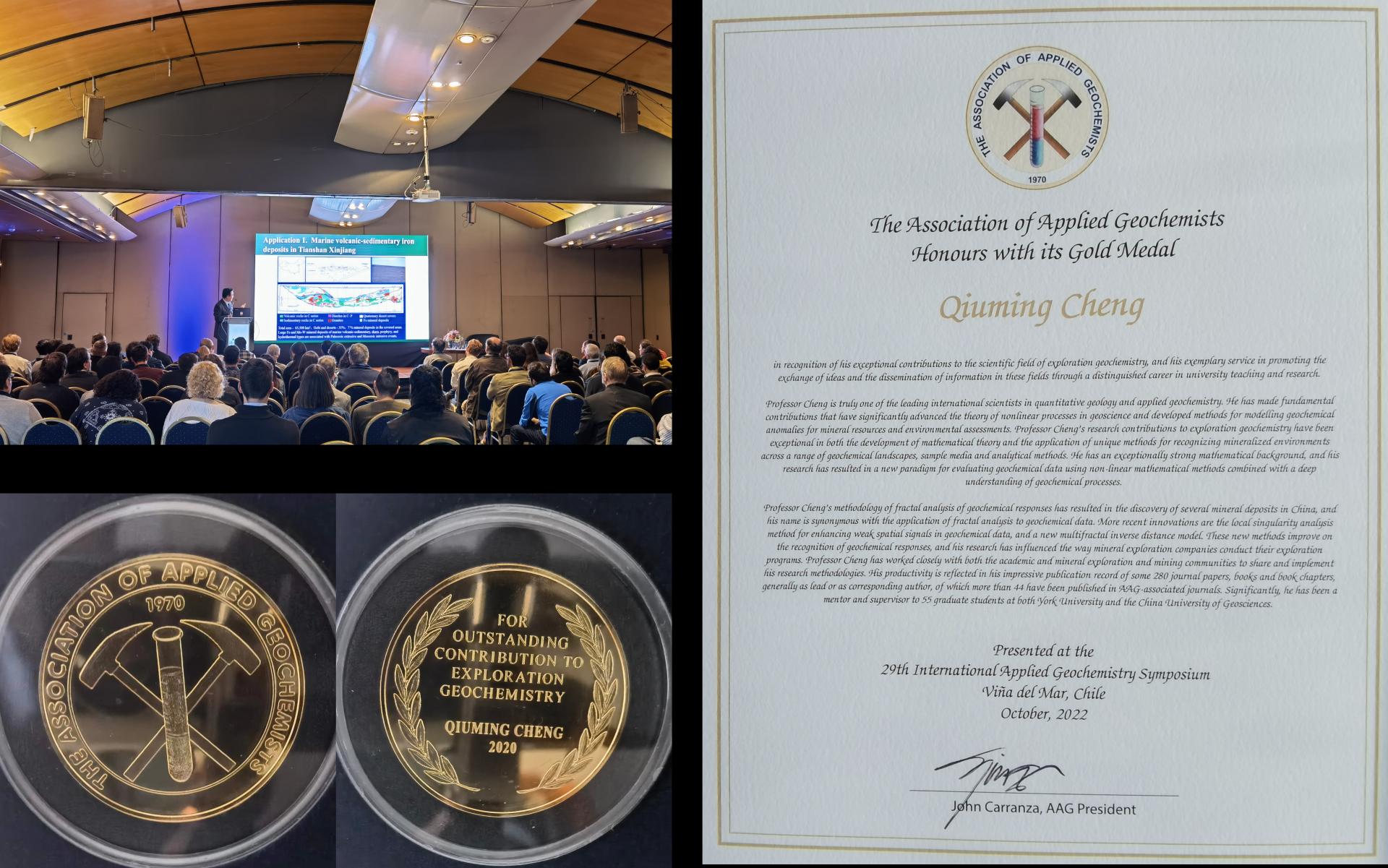 国际应用地球化学家学会主席、南非科学家John Carranza在颁奖词中介绍,成秋明是定量地质学和应用地球化学领域国际真正顶尖科学家。他为地球科学中的非线性理论和矿产资源与环境评价方法的显著进展做出了重大贡献。他对勘探地球化学研究领域的贡献不仅在数学理论的发展,而且在研发适于不同地球化学景观、取样介质和测试分析方法条件下的地球化学异常识别方法和应用方面都非常出色。他的研究通过地球化学过程深入理解和非线性数学方法使用的结合,为地球化学数据分析提供了一个新范式。