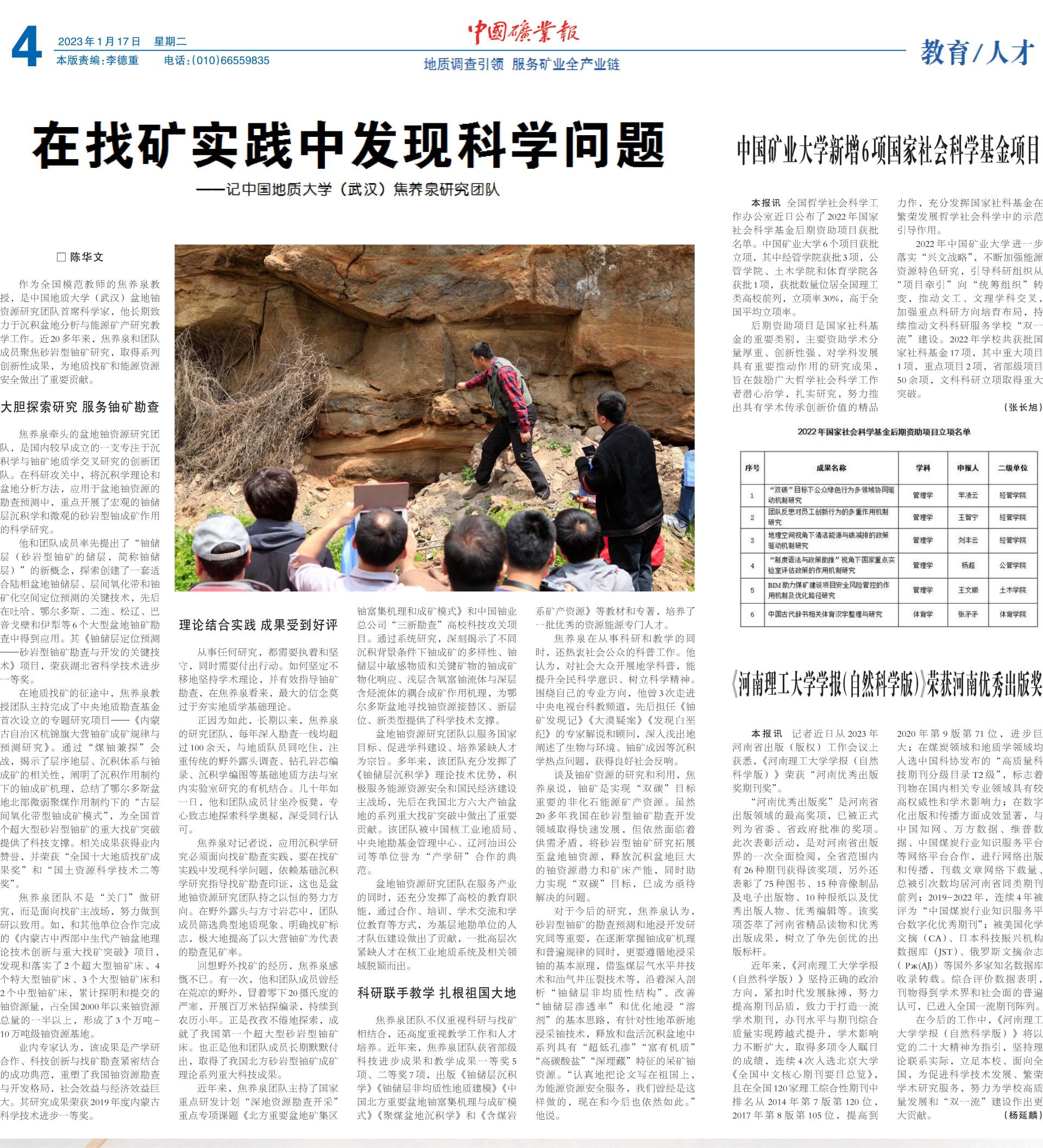 正因为如此,长期以来,焦养泉的研究团队,每年深入勘查一线均超过100余天,与地质队员同吃住,注重传统的野外露头调查、钻孔岩芯编录、沉积学编图等基础地质方法与室内实验室研究的有机结合。几十年如一日,他和团队成员甘坐冷板凳,专心致志地探索科学奥秘,深受同行认可。
